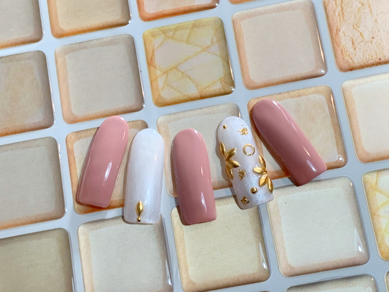 モカピンク×パールホワイトゴールドスタッズで花柄っぽくしたデザインです。白をパール入りにすることでグンと冬っぽさを感じます。(予告なく終了がございます)