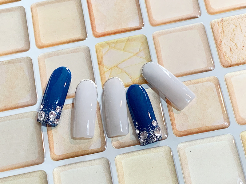ネイビー×シアーグレーエッジラメと、ストーンビジューでキラキラに。ベースが深めのネイビーなのでストーンが映えます!(予告なく終了がございます)